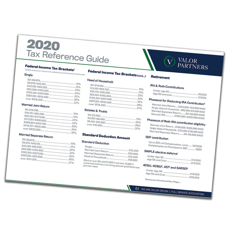It’s that time of year again and we know things can get confusing. That’s why Valor Partners-your tax partner-has developed a quick reference guide for 2020 that outlines federal tax deductions, 2020 tax brackets, dividend rates and much more.